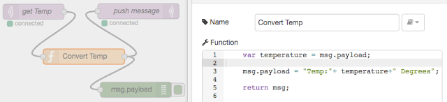 We read the msg.payload, modify and and write it back before passing it on to the send node. In fact we can make any changes we like. For example we can indulge the British habit of reporting cold temperatures in C (it was -2 last night!), and warm temperatures in F (awesome holiday - 80 degrees all week!). There's little confusion as we simply never use the values between 20 and 50!